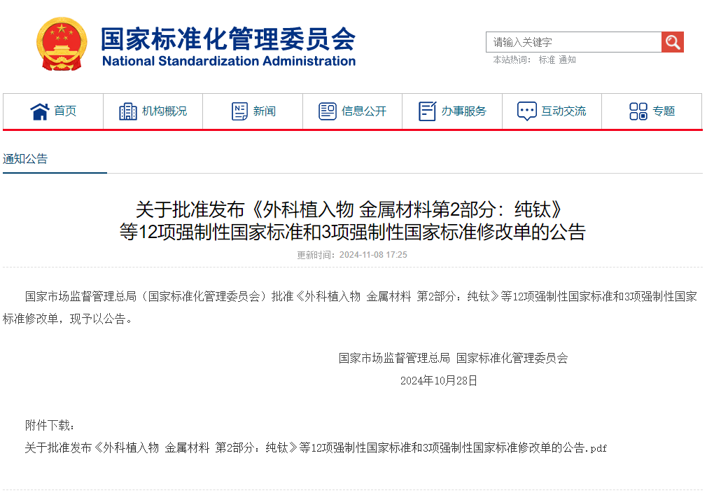 关于批准发布《外科植入物 金属材料第2部分:纯钛》等12项强制性国家标准和3项强制性国家标准修改单的公告