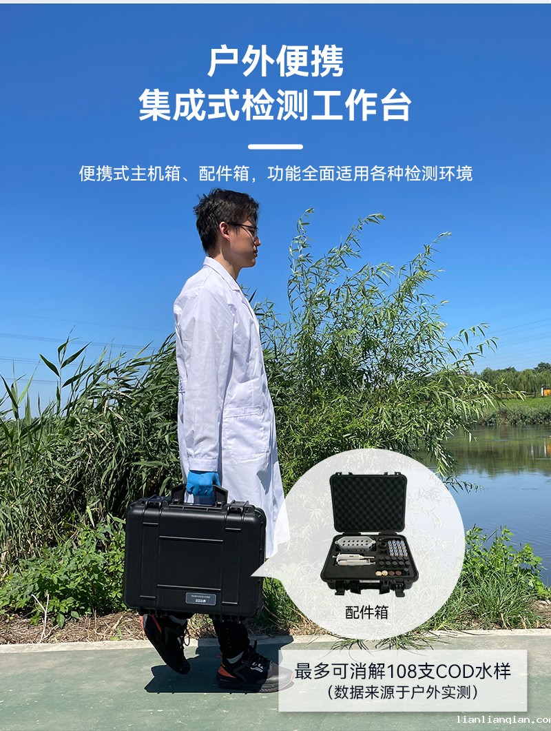 光源的持久耐用也是LH-C600的一大亮点。内置8个可见光波长LED光源,寿命长、更稳定且故障率更低,大幅降低了使用和维护成本。同时,户外检测便携性也是该仪器的一大优势。采用主机箱+配件箱的形式,耗材、配件完备,户外检测方便快捷。大容量锂电池更是确保了仪器在户外无电源条件下连续工作8小时以上的能力,让水质检测不再受地点和时间限制。
