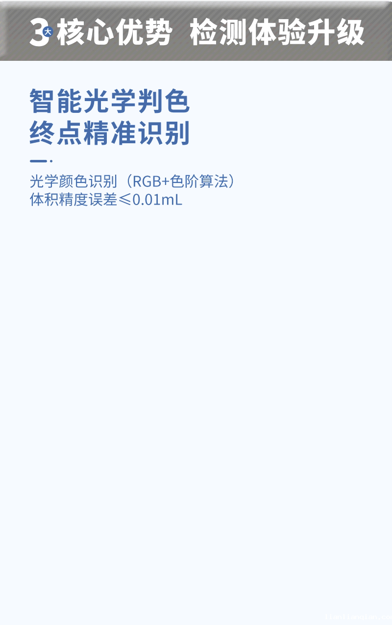 2、模拟人工自动进行滴定,内置RGB模式算法、色阶判断,自动判断滴定速度、终点,提高滴定效率;